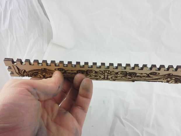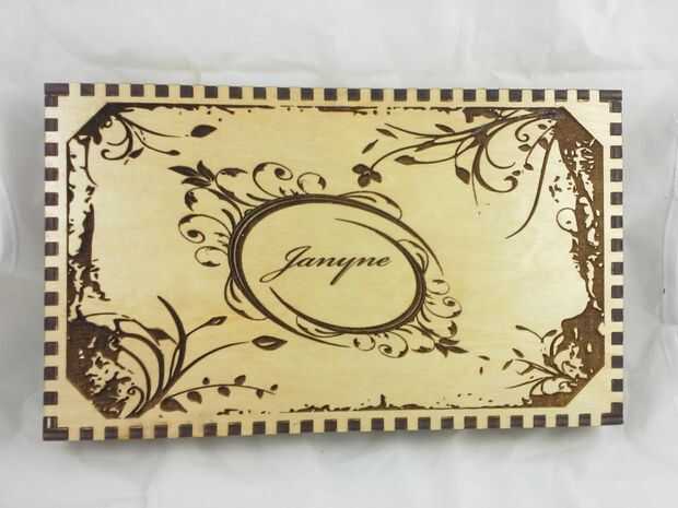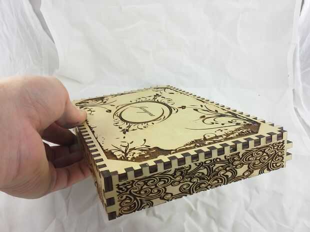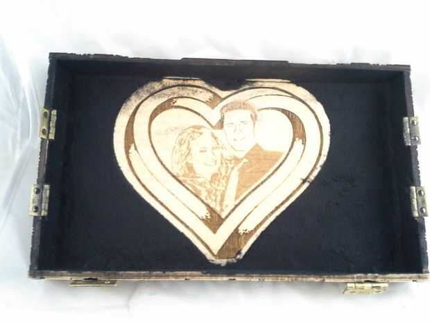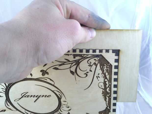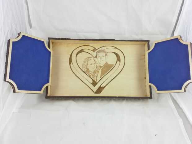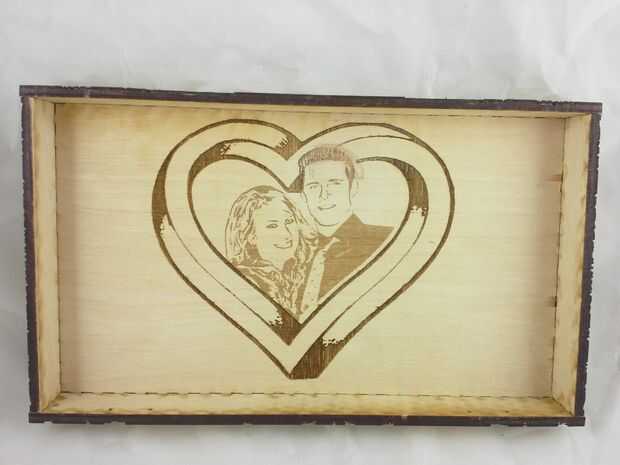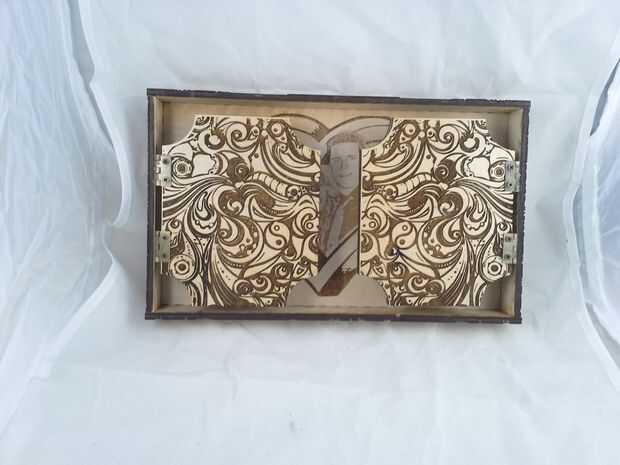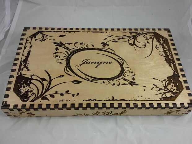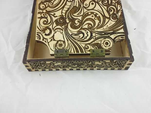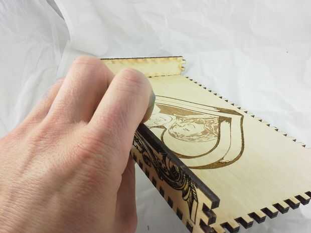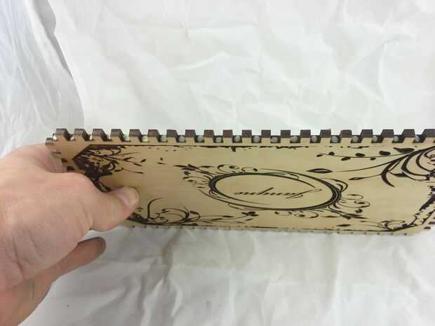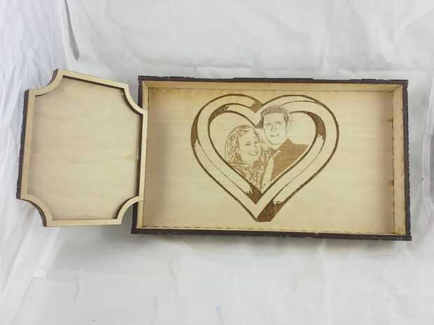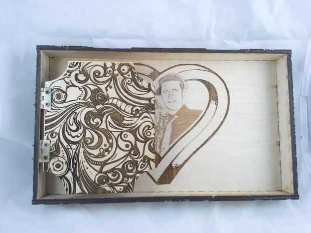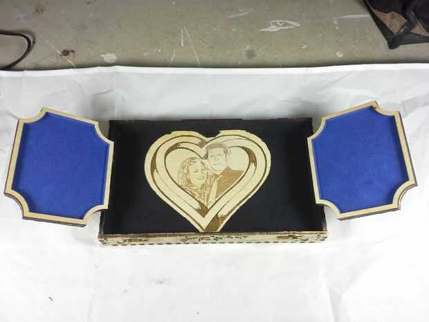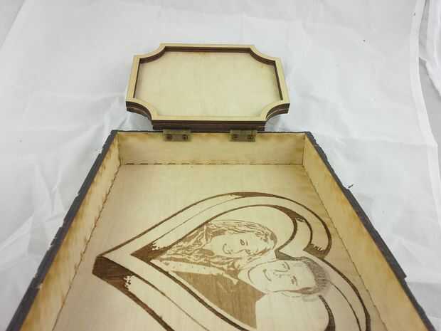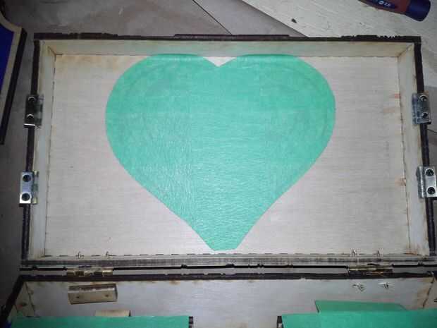 Descargar el archivo de vector que contiene el contorno del corazón agrandado, configurar su láser cortador de la energía muy baja y corte la plantilla. Aplicar la plantilla de corazón encima de los grabados en la tapa, tratando de centrar lo mejor posible. Luego aplicar pegamento reuniéndose con el resto del interior de la tapa y aplicar el rebaño negro. Deje que se seque y quite la plantilla de corazón que cubre los grabados. Vuelva a colocar el interior alas a la tapa y hemos terminado con la tapa!