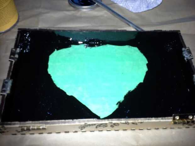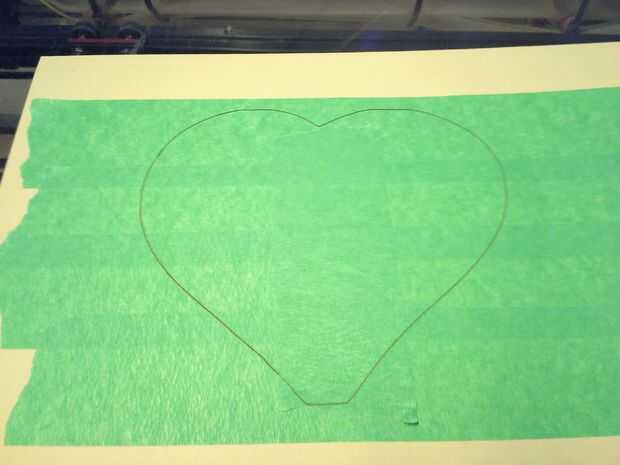Quería disimular las pequeñas quemaduras dentro de la tapa pero necesitaba para mantener el centro de grabado visible. Decidí cortar un contorno agrandado del corazón grabado en cinta de pintor, cubre el centro del grabado con él y el resto de la tapa de la multitud. Esto fue lo mejor de ambos mundos cuando conseguía cubrir las quemaduras pequeñas, mientras que al mismo tiempo mantiene el centro de grabado visible.