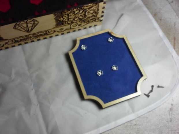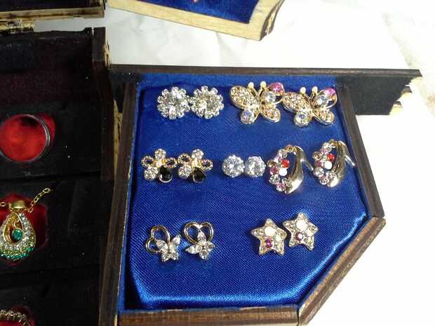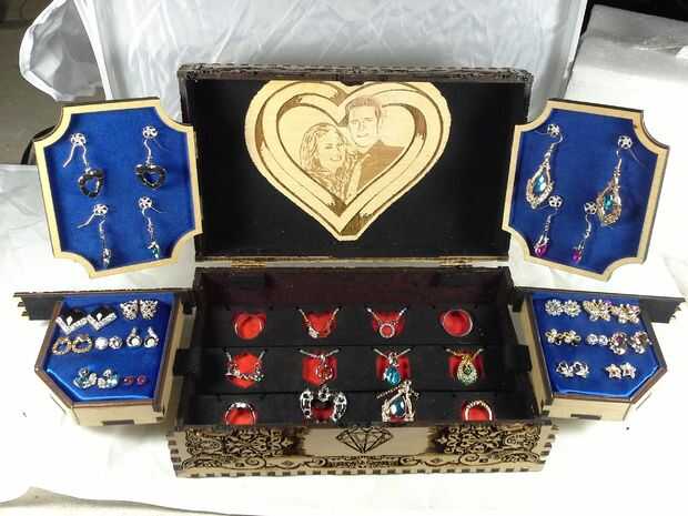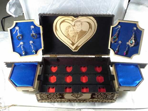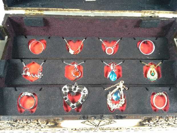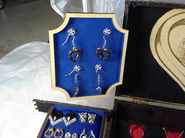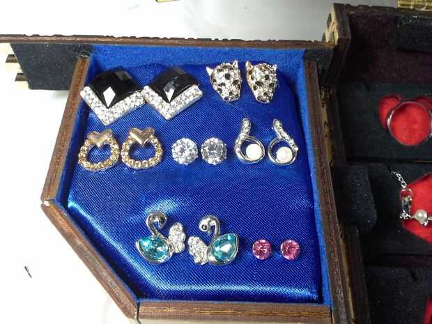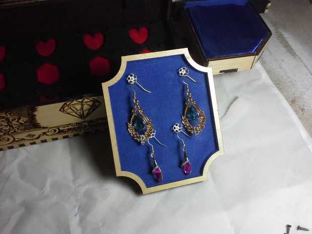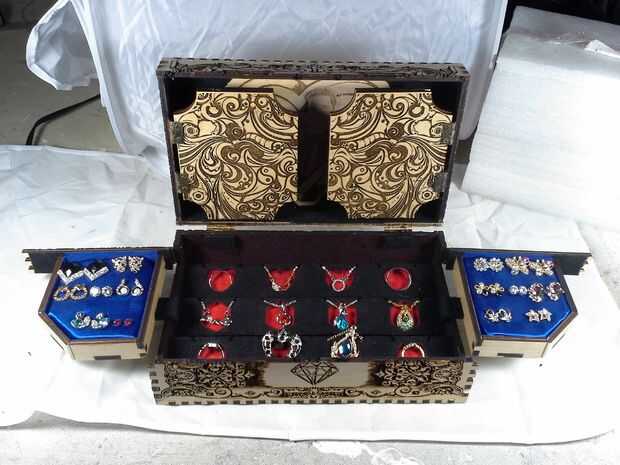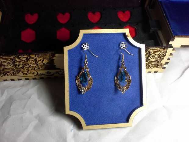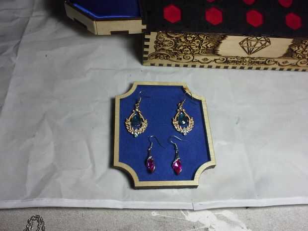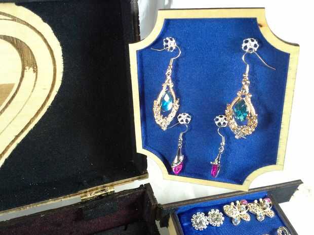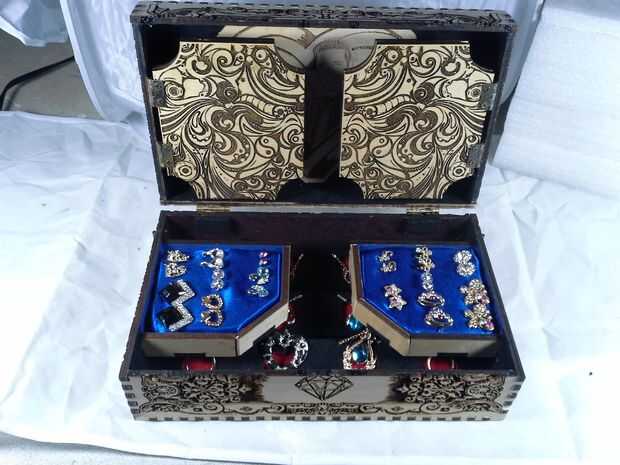 Después de configurar los soportes en las alas, volver a Fije las alas a la caja de la joyería y los pendientes a los titulares. Puede proceder a agregar joyas a las tres barras en la base de la caja de joyería y luego rellenar las esponjas con pendientes. Tienes que tener cuidado de no colocar cualquier joyería que es muy alto en las tres parrillas golpeará a los cajones plegados.