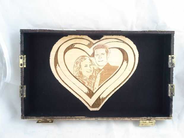 Otra cosa que despelotarse en fue el grabado de la foto. No sé por qué, pero de alguna manera que el láser logró que fuera de la alineación entre el corazón y la foto del grabado. Traté de adivinar el lugar correcto pero cada vez re-corrí la foto grabado operación estaba todavía apagado. Por último, sólo dice que diablos con él y dejarlo ir. Es de 1mm o así pero no tenía tiempo para grabar la parte superior de una pieza nueva, luego córtelo hacia fuera, línea en el cortador del laser hacia abajo otra vez, grabar el corazón y luego grabar la foto otra vez. Al final, todavía resultó bien y dejé que deslice.