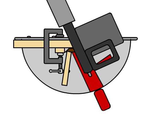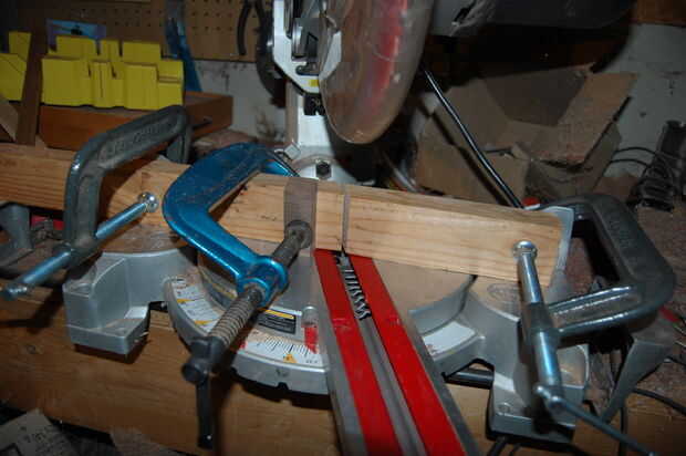 Una sierra para cortar ingletes es la opción mejor y más precisa para cortar ángulos perfecto 22,5 grados para hacer un octágono. Sin embargo, una lámpara específica es necesaria para cortar con seguridad estas piezas. En primer lugar, un sacrificio abeto de 2 x 4 se atornilla a la cerca. A continuación, corte a través de la 2 x 4. Esto actuará como una inserción con holgura de cero con una sierra de mesa. Después de un bloque de tope es afianzada con abrazadera 2" de la hoja para asegurar que las piezas son todas la misma longitud. Una varilla de empuje se utiliza para sostener la pieza de trabajo contra el tope-guía.
