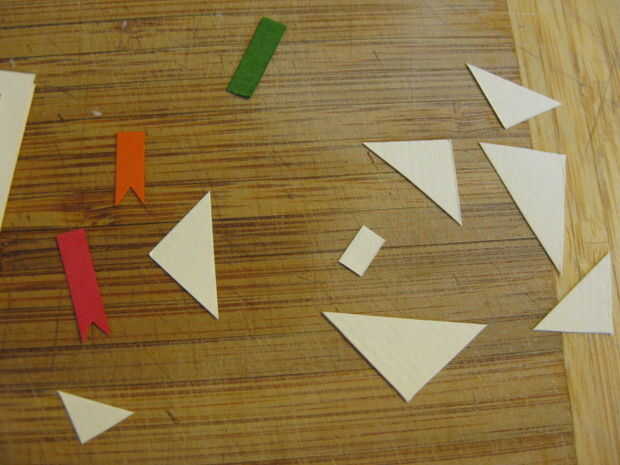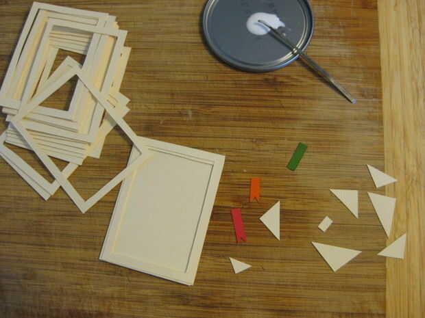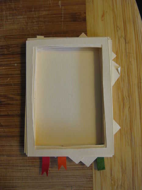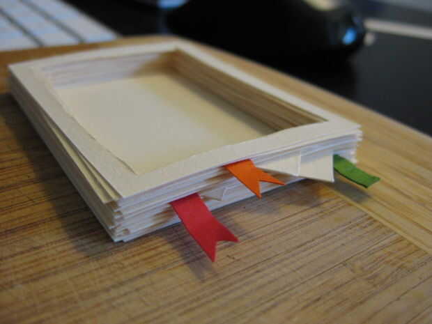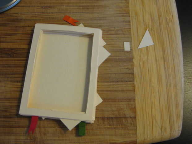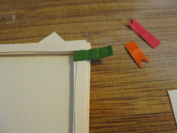 El Enchiridion es un libro bien usado y tiene un par de marcadores y páginas sueltas. Cortar unos triángulos de ángulo recto para pegar en como páginas sueltas. He dejado una página entera sobre la parte inferior, usted podría dejarlo abierto a la tapa trasera Si quieres.