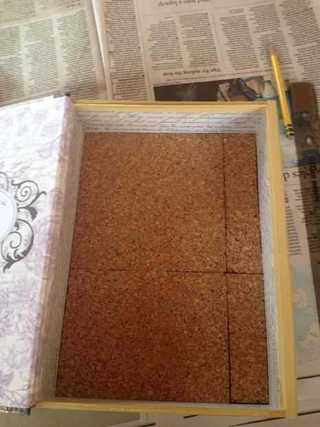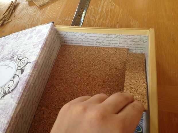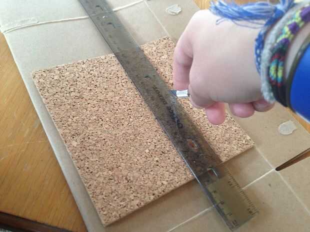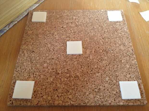 Con el cuchillo del Exacto y una regla para cortar el corcho en la parte posterior de la caja. Coloque los cuadrados adhesivos en el corcho. Dependiendo del tamaño del corcho utilizar cuadrados de 2 a 5 por pieza.
