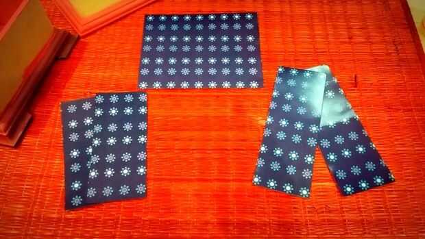 Por el momento, que se seca caja, cortar el papel según las dimensiones de la caja. Para la cubierta superior, corte 6.5 X 5.5 pulgadas, de lados más largos de la caja - 7 X 2.5 pulgadas, 2 tiras de y para los lados más cortos, 5,75 X 2.5 pulgadas, 2 tiras se requieren.