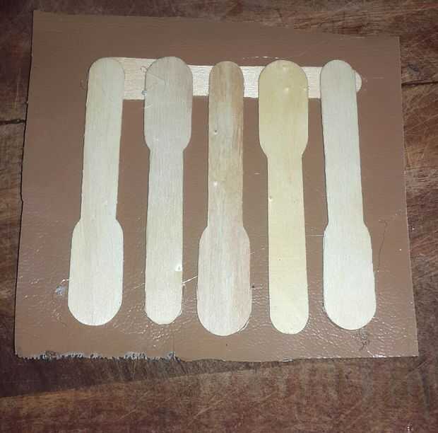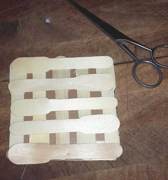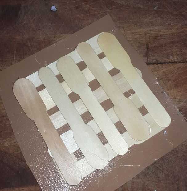 Tomar un palo y encolado en tu pieza de tela. A lo largo de la longitud de la vara pegada, colocar algunos más palillos como se muestra y pegar. Girar la pieza y repetir el proceso para hacer un patrón entrecruzado. Cortar la tela sobrante para que ninguna muestra de los lados. Su base se hace.