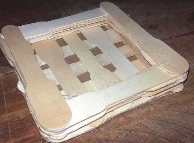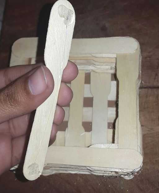 En uno de los lados, tome un palo y encolado para que el extremo más amplio es apuntando hacia el extremo más estrecho. Lo mismo para el lado opuesto. Ahora gire la base y repita el proceso para ambos lados como se muestra en las imágenes.