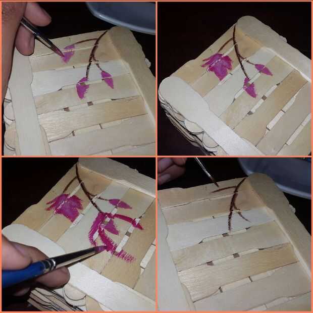 La diversión parte. Decorar sin embargo la forma que desee. O simplemente seguir mi ejemplo. Coge tus pinturas de acrílico y pintar algunas flores. Usé pintura de plata en lugar de pintura blanca para dar mis flores un efecto brillante. Después de agregar hojas, le di un tinte de color marrón oscuro a las flores para darle un bonito aspecto vintage.