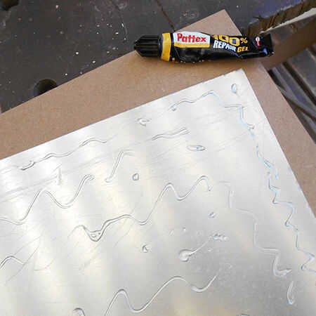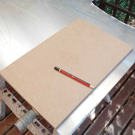 2. use la tapa de la caja como plantilla para corte fino, hoja de aluminio para encajar. Dibuja alrededor de la tapa pero cortar la lámina de aluminio ligeramente más pequeño que el tamaño de la tapa. Necesita hacer esto para unir las molduras de pino alrededor del borde más tarde. Puede utilizar un rompecabezas y una cuchilla de acero para cortar la hoja de aluminio, o una multiherramienta Dremel y disco de corte.