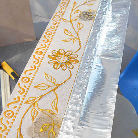 7. deje que la pintura se endurezca antes de aplicar la cinta de aluminio. Aunque muestro que me puse en la parte superior - empezar con la tira de centro y luego los bordes superior e inferior.