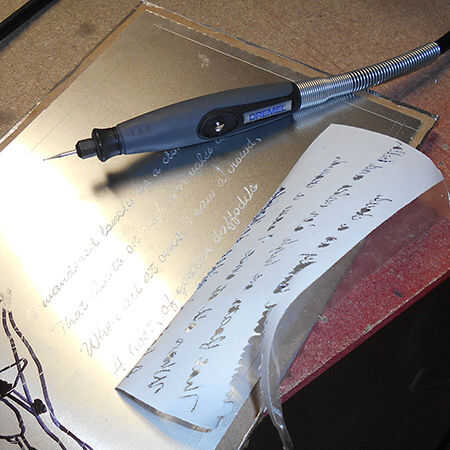 11. usando un eje de flexi #225 y cortador de grabado #105 para hacer un esquema inicial a través de la plantilla. Levante la cinta adhesiva de sujeción de vez en cuando para que usted puede comprobar que el texto se muestra claramente. Sea paciente y tómese su tiempo con las letras individuales.