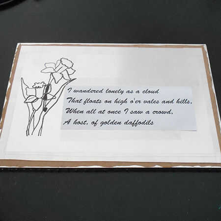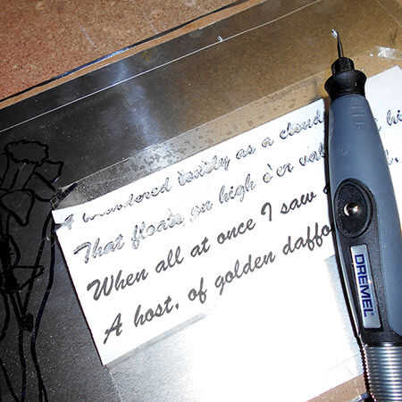 12. después de que la redacción Retire la plantilla y repetir con un #106 cortador de grabado. Los narcisos se esbozaron con marcador indeleble antes de grabar con un poco de grabado #106. Limpie con un paño suave y WD-40 o aguarrás mineral.