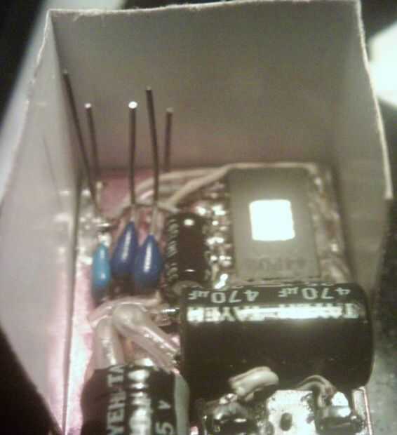 Una especie de caja se hace con una cinta de papel grueso alrededor de la Junta, y el caliente derretimiento pegamento derretido y fluido alrededor de los componentes utilizando mi herramienta de aire caliente, equipada con una boquilla estrecha.