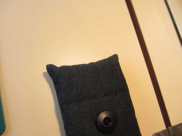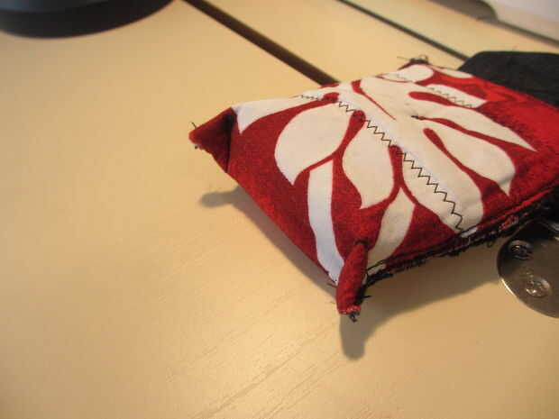 Da vuelta el caso adentro hacia fuera otra vez, usted simplemente dobla las esquinas para que la costura lateral forma el punto medio de un triángulo. Luego coser en toda la esquina. Mi cámara es alrededor de 1 cm de espesor, así que cosí a través de un triángulo de 1cm. Repita para la otra esquina.