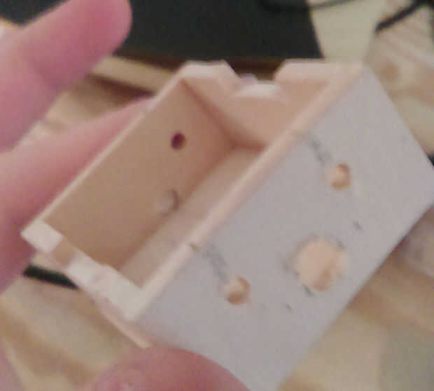 Taladrar cuatro orificios para el cable del anillo Neopixel y dos agujeros para encajar la fotorresistencia y el láser. Yo también muescas en una pequeña sección para el anillo de Neopixel sentarse por lo que el ojo de la cerradura puede fijarse directamente a la cara frontal.