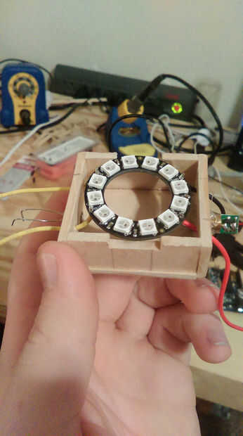 Una vez que la caja es construida, caliente pegamento en el foto resistor. Después de eso, pegamento caliente en el láser. Te recomiendo engancha hasta poder en primer lugar, para que pueda hacer que el haz esté directamente sobre la fotorresistencia. Con estos dos componentes en su lugar, puede pase los cables a Neopixel a través de los agujeros y péguelo en.
