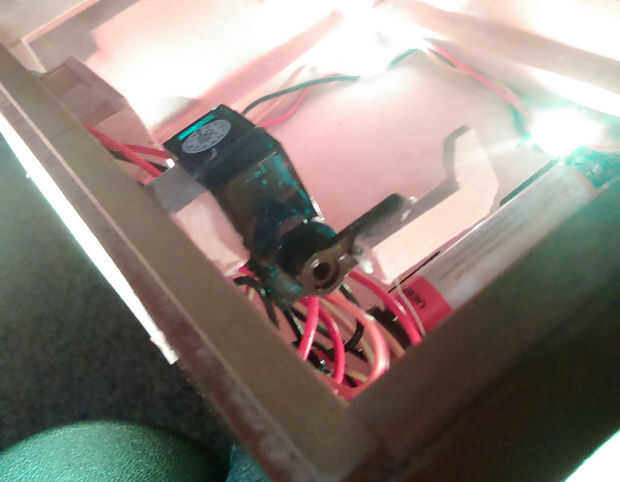 Al final, después de montar el servo, fui capaz de conectar un gancho pequeño que corte de madera en el servo, usando pegamento caliente. El gancho de madera pestillos en el estante pequeño que he añadido en la tapa de la caja. Es un bloqueo muy fácil y simple de hacer. Si estás interesado en mejor se traba, por favor mirar la sección de ideas, como ir sobre algunas otras opciones que podido con.