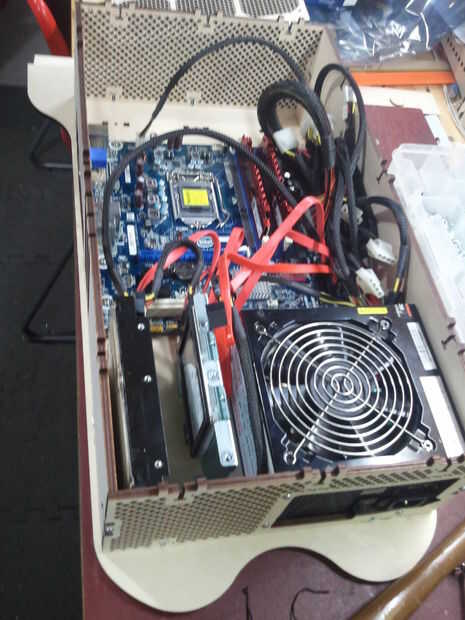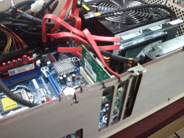 Todas las placas madres vuelven con un IO la placa, que debe encajar en el agujero lateral enorme. Puede medir eso antes de que lo corte. Luego instalar la Motherboard, Tarjeta madre, fuente de alimentación y disco duro.