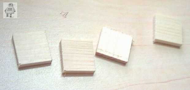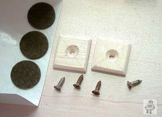 Hice un juego de pies (8 total), de recortes madera de palo de pino. Son cuadrado de 24mm y un agujero avellanado se ha puesto en el centro a los tornillos por debajo de la madera. Más tarde, una almohadilla autoadhesiva a entrar en la cabeza del tornillo.