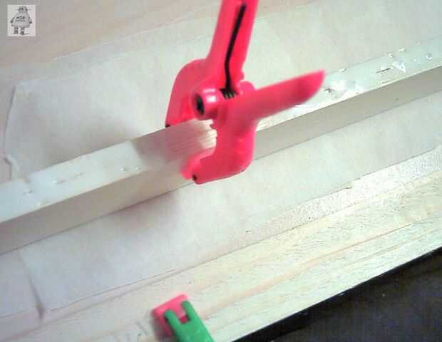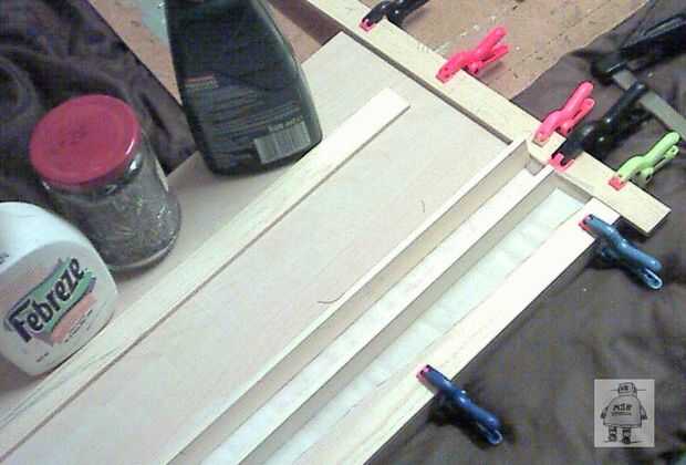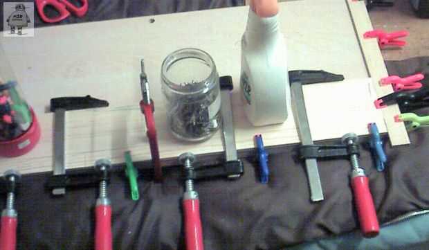 Utilizando un par de los palillos de pino y una junta plana como una guía de ángulo recto borde y un montón de pinzas, empezar pegado a las tablas!