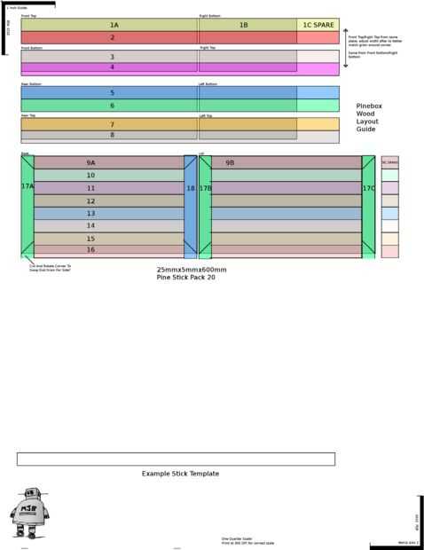 Usando el modelo de diseño de la batidora, he creado un diseño de guía de corte aproximado para ver cuántos palos de pino necesitaría. 19 palos se necesitaría para hacer la caja externa, para no estira un paquete de 20. Pack de 40 es entonces, dejando a bastante más de las otras piezas de madera dentro.
