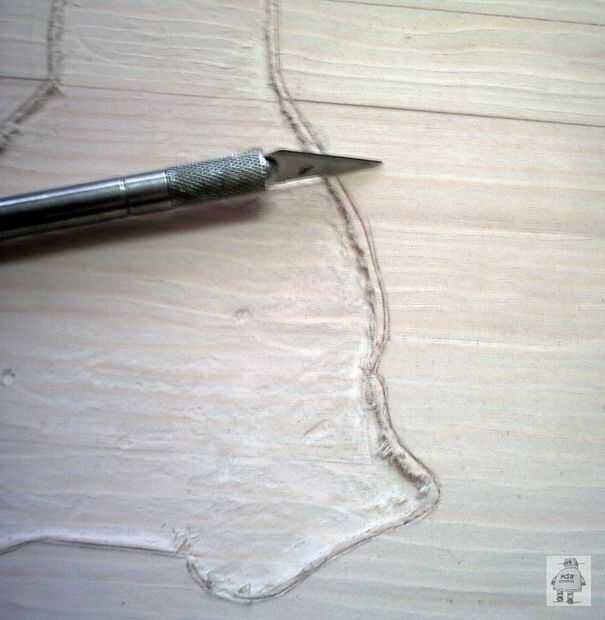Para el logo de marquetería había trazado alrededor del exterior y corte una rebaja de unos 2mm de profundo casi a esa línea, usando la plantilla del cortador de fresado. Una vez hecho esto, puede utilizar una hoja x-acto a mano acabado más cercano a la línea y luego la arena plana la base del agujero. ISH.