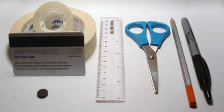 Tarjeta de crédito (o similar) Cinta de enmascarar Cinta adhesiva Imán Regla Tijeras o cuchillo de Stanly Pluma/lápiz de colorante (el naranja era el color que elegí) Marcador permanente