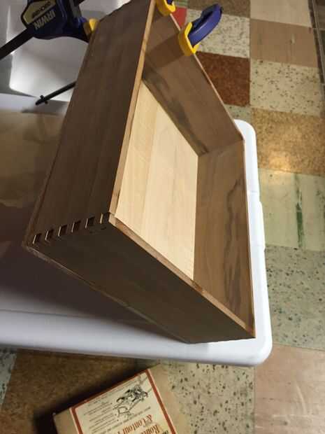 Utiliza un pedazo de papel como un aplicador para conseguir pegamento para madera en cada una de las articulaciones de la caja y luego cinta de pintor en las esquinas para darle apoyo. Las uniones de la caja son probablemente lo suficientemente apretadas para mantener la caja mientras se seca el pegamento pero quería algo de seguridad extra. Desde el fondo de la caja se fijará también esta había pegado en pero utiliza Nexabond sobre la recomendación porque quiero que la parte inferior para ser muy seguro ya que puede soportar peso.