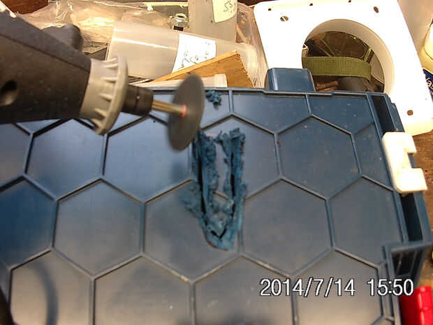 utilizando una dremel con un disco de corte para cortar a lo largo de las marcas para hacer agujeros en los lugares adecuados