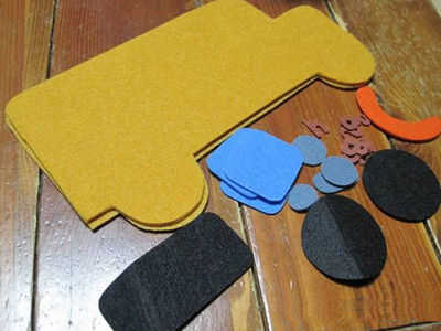 Cortar tela de fieltro amarillo de dos piezas de forma de autobús, una pieza negra para hacer la puerta y dos piezas para hacer las ruedas. Cortar a tela azul en tres pedazos para hacer vasos y una pieza para hacer espejo y una pieza para hacer luces. Cortar a tela naranja en forma de media luna dos.