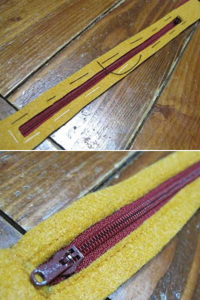 Cortar tela amarilla pedazo largo con el mismo ancho de la cremallera. Hacer un corte a lo largo de la tela amarilla.