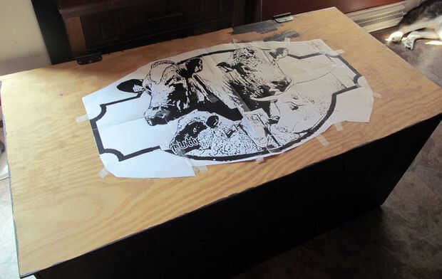 Creé una plantilla de diseño en mi ordenador con Photoshop y (a escala) impresa en hojas de papel de tamaño legal que tenía para luego ser grabado juntos.