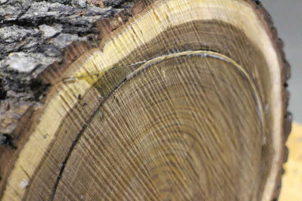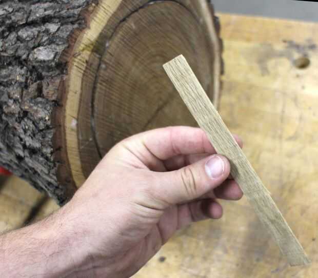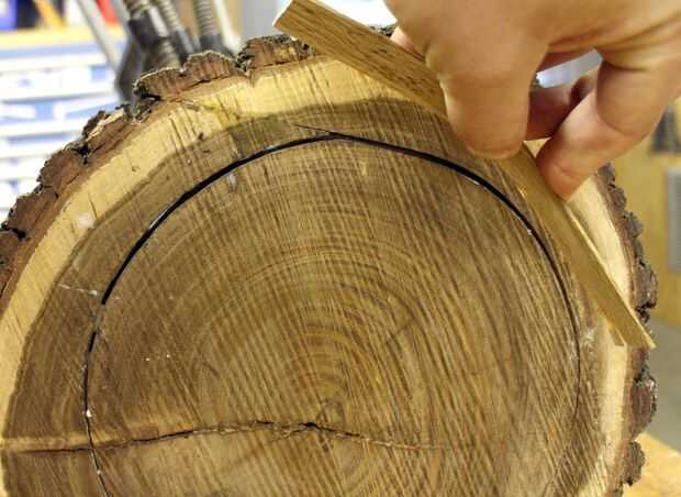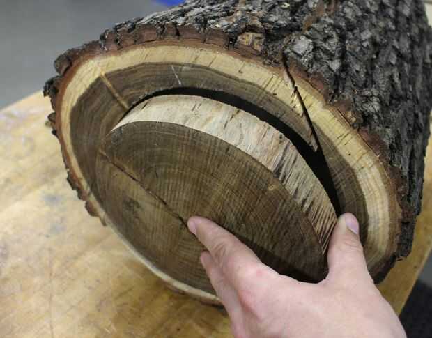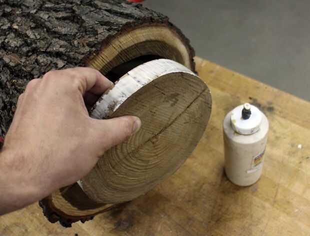 La sección de corte de la base sólida se puede pegar en la parte inferior del tronco hueco. Para tener en cuenta para la madera del Sierra de cinta corte una tira de desecho de madera fue utilizada para meter una cuña entre el interior del tronco hueco y la sección de corte de núcleo sólido.
