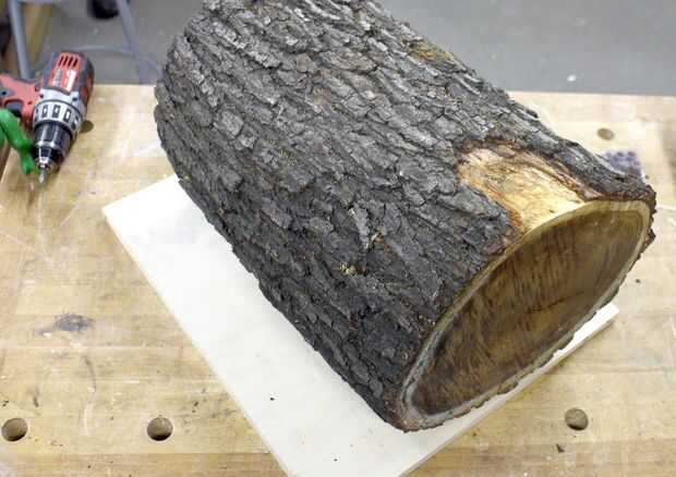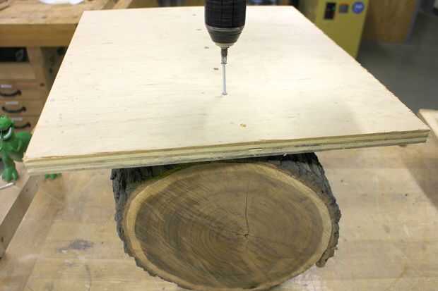 Un trozo cuadrado de madera contrachapada de 3/4" fue unido a la sección más plana y más directo del registro. La madera actúa como un trineo cuando empuje a través de la Sierra de cinta y será el punto de referencia que se enfrentarán el registro hasta.