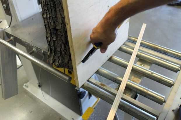 Alinear el extremo irregular en la trayectoria de la hoja de Sierra de cinta cuadrada el trineo con el borde de la mesa otra vez y clavó la pista de mitre de desecho debajo del trineo. Luego pasa el registro a través de la b