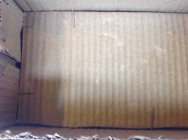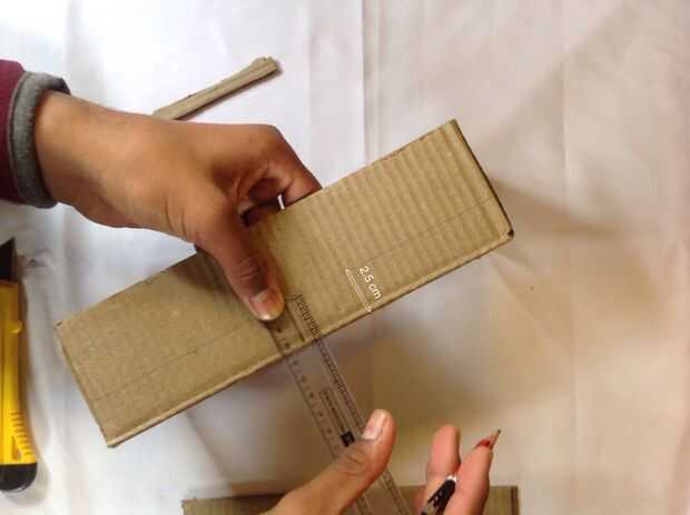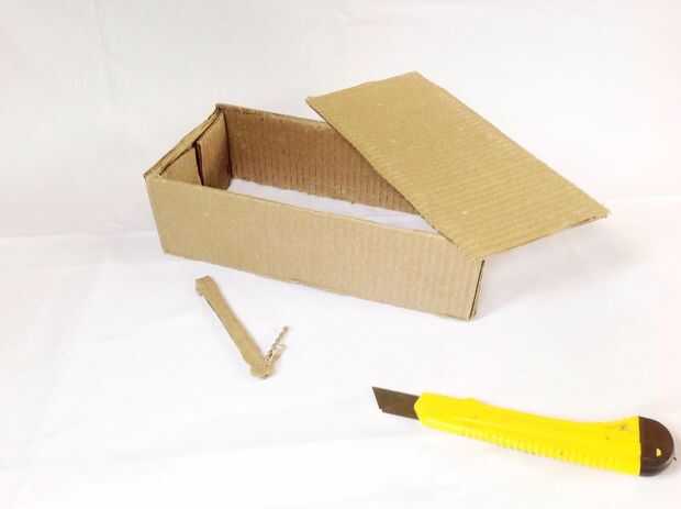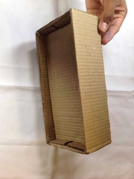 Primero se corta la base de la caja como se muestra en la imagen. Luego marcar 2,5 cm en la caja. Poner pegamento en los bordes de la pieza de corte y coloque dentro de la caja a lo largo de la línea marcada. Poner algunos todos los pines a través de la caja en la abertura como apoyo. Esto impediría que el corte salga.