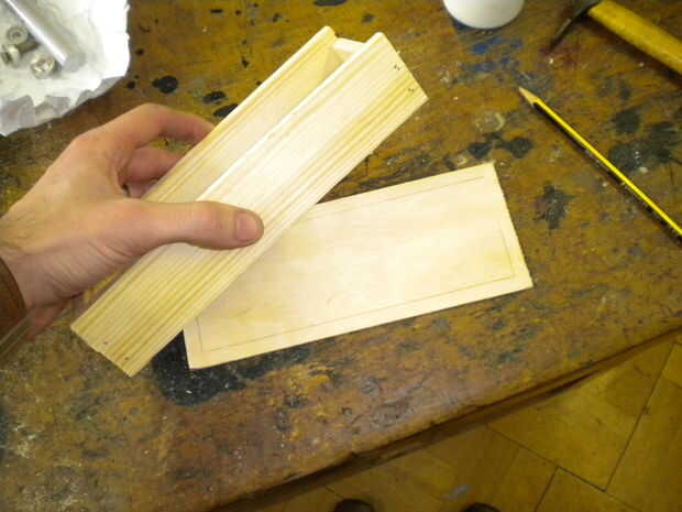 Coloque el marco sobre la base y luego dibujar en el interior borde con un lápiz. Esto demuestra que el grosor de los bordes del marco y ayuda a evitar la mala alineación de los pasadores. Igualmente espacio seis alfileres alrededor de la base (ver foto) Mida 60mm en los extremos del lado largo y el que está en el lado corto del centro.