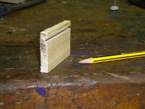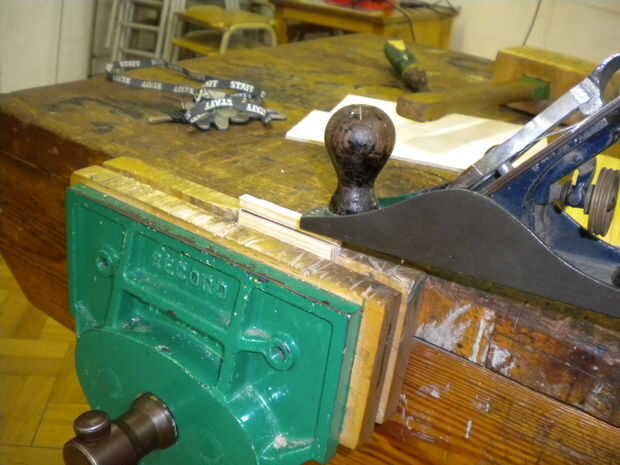 En el más pequeño de los dos extremos, lápiz una línea en el borde inferior del canal, este espectáculo donde quitar material hasta. Poner la pieza en una prensa de madera, utilizar un avión para depilar la madera hasta la línea. El imágenes muestran que si usted plano de un lado sólo se obtiene un corte wonky... alternar el corte de un lado y el otro, esto mantiene el nivel de corte. Al llegar cerca de la línea, parar y terminar la última 1 mm en una lijadora de disco.