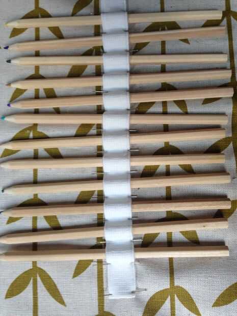 • después del segundo perno, colocar el lápiz y coloque el elástico en la parte superior, esto no tiene que ser super estirada un poco tendrá el lápiz. prender al otro lado. Continúe hasta que te quedas sin lápices o tela. Para este tutorial he utilizado un paquete estándar de 12 lápiz y sacapuntas. Que funciona bien para el tamaño de la tela, pero también he hecho más de uno en el pasado se necesita ampliar la longitud de la tela para hacerlo.