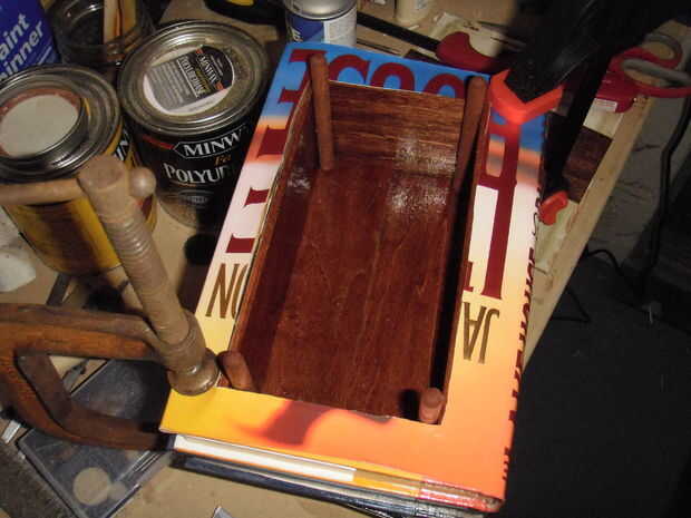 Para aquellos de ustedes que hizo la línea dentro de sus cajas, tomar los corte los trozos de espiga y utilizando el papel de lija alrededor de cada extremo y luego les mancha. (I sostenido con las pinzas y sumergido directamente en la mancha, les voltea y sumergido otra vez para la cobertura total. Parecía funcionar bastante bien.) una vez que la mancha está seca usted puede luego pegarlos en el lugar con el pegamento de E-6000. Una en cada esquina como recto para arriba como sea posible y esperar que se seque