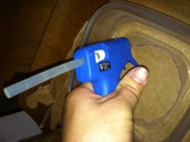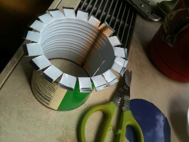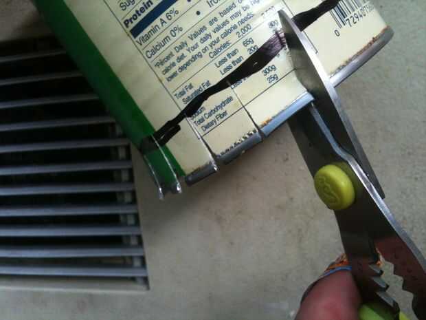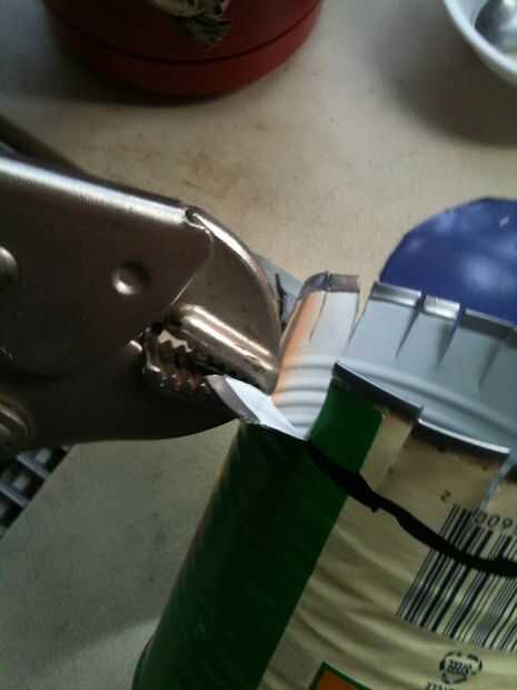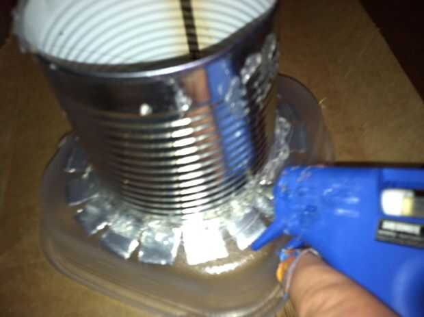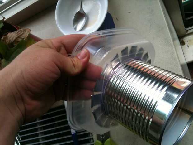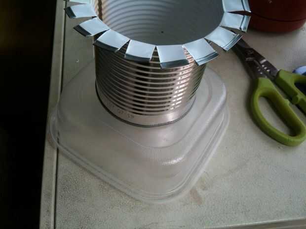 Grandes latas vacías (28oz) están lo suficientemente cercanas de diámetro para volver a ser propuesto en un gran adaptador estándar de 4" manguera conducto secador flexible.  Tijeras o los esquileos de las aves de corral bien hecha, servicio pesado cortan fácilmente a través de la can.  Combinar con sobras plástico estándar cuadrado desechable 25oz / recipiente del congelador y algunos granos generosos de pegamento caliente para sellar el trato y por alrededor de $1 con eficacia han construido un reborde de conducto secador.  Mantenga la tapa del envase a la mano como lo usaremos más adelante como una un montaje de acoplamiento hermético en la parte posterior de la catbox.