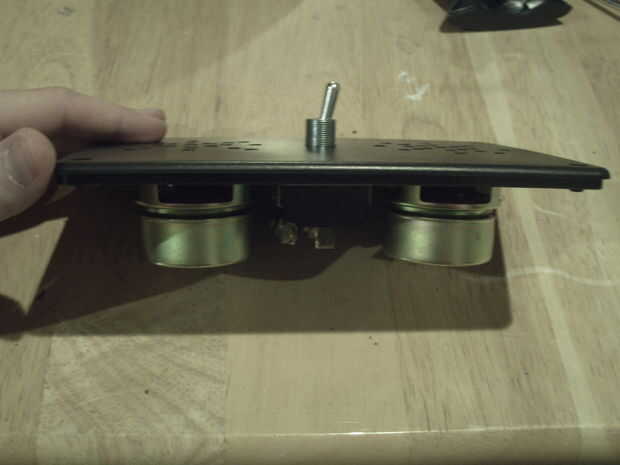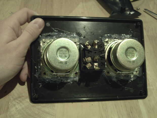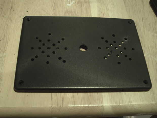 a continuación, perfore un agujero para el interruptor, doble comprobación de que el interruptor permanece firmemente en su lugar en el agujero. Si usted tiene una arandela para pasar el conmutador, compruebe que sostiene firmemente el interruptor. Un diseño de altavoces agujero fue perforado con mi Dremel con pequeños pedacitos de taladro Dremel y una broca debería funcionar bien, así. Para ello, perforé dos cruces separados. Uno con dos orificios en los cuatro lados del orificio central, y la otra cruz con tres agujeros en los cuatro lados del agujero del centro. Ahora instalar los altavoces y el interruptor. Seguro el interruptor con pegamento caliente o con una arandela y seguro los altavoces con pegamento o tornillos. Me encontré con pegamento caliente para trabajar bien para los altavoces y el interruptor en un sujetador.