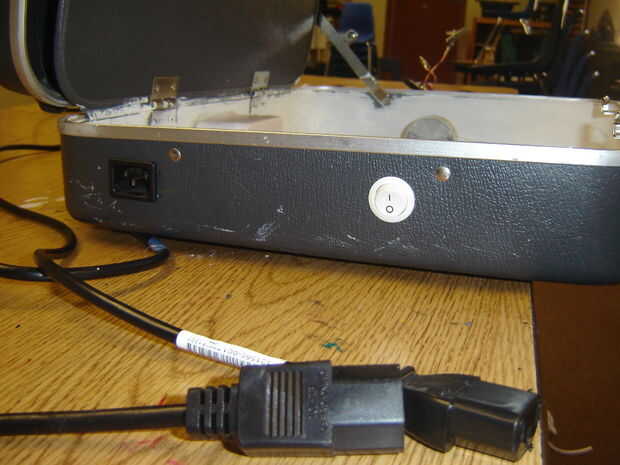 El cable de la luz fue unos 12 pies de largo así que corte para sobre un pie. Guardé el enchufe/transformador y caliente pegados en la inferior/posterior de la caja. No utilice el cable original porque quería desmontable.