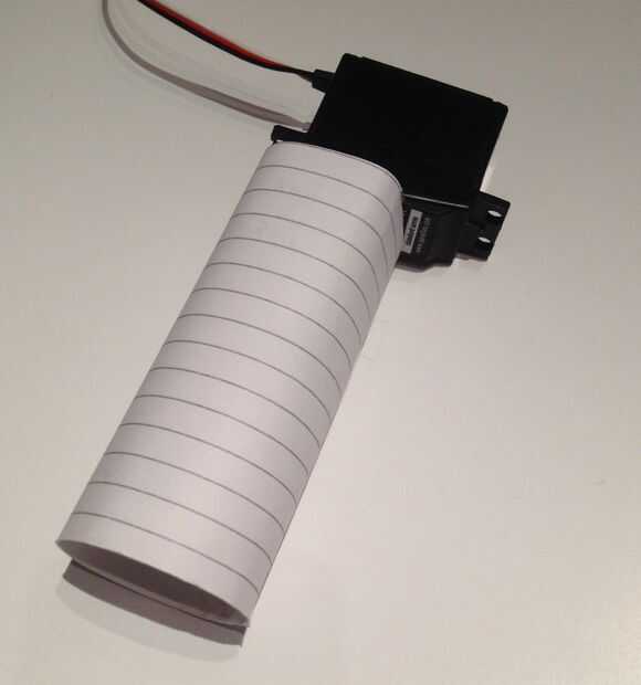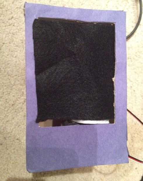 Para la última parte de este proyecto, necesitamos establecer una cortina de la ventana.  Primero, corte un trozo pequeño de tela en la forma de la ventana. Luego de rodar un pequeño trozo de papel en un tubo que se ajuste alrededor de su servo. Esto funcionará como una "barra de cortina". Conecte el servo en el interior de la caja, al lado de la ventana. Con el servo gira 180° en la posición "baja", cinta de la tela a la barra.