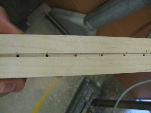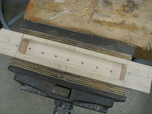 A continuación, utilice una 1/8 broca y 6 perforaciones de la parte superior de la pieza que sólo embolsaron hacia fuera. Los agujeros se encuentran en dado corte antes, recorrer todo el camino y debe ser dispersadas uniformemente a través de la sección donde se sentará el cristal. Estos serán para el LED