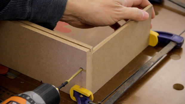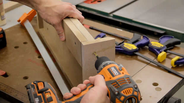 Comencé a armar la caja por los lados hasta el fondo, de sujeción asegurándose de que las piezas estaban al ras. Luego pretaladrado y había avellanada dos tornillos de 2" de la parte inferior en cada uno de los lados.