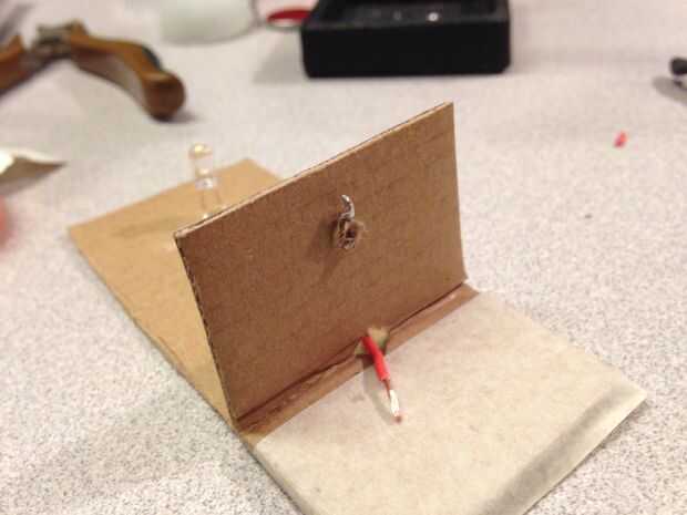 Poner el cable rojo a través del orificio de corte en el pliegue. Cinta hacia abajo.