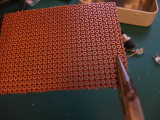 Primero vamos a recortar el tablero perf para el tamaño de la lata. (Foto 1) Puede utilizar el cable - snip a lo largo de una línea de orificios, generalmente una sección voluntad volar con cada recorte - o agarre a lo largo de una línea con sus pinzas y doble y gire una sección. Este segundo método es más rápido y más fácil. Asegúrese de que la placa es suficientemente grande para asiento cómodamente su LED y resistencia, que deja suficiente espacio para su conmutador en un extremo.