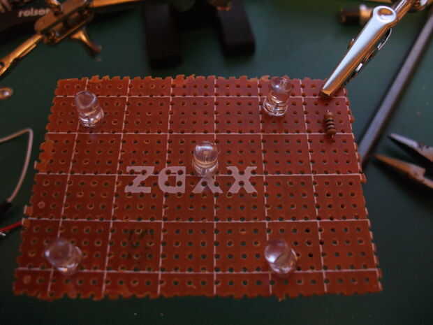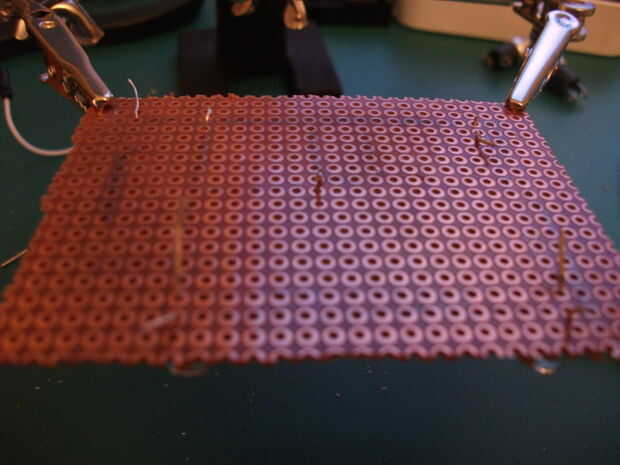 Nota: Los espacios entre agujeros resistirá la soldadura, y será necesario un poco de bromas y persuasión para poner canciones como las que se muestran. Esto ha llevado a una conexión chunga a dos de los LED en la board, pero soy un novato en soldaduras.