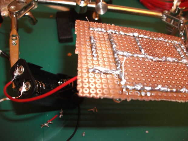 Ahora es tiempo de terminar el circuito. Solde el cable positivo a la resistencia y el cable negativo al cátodo de resistencia. (Foto 4)