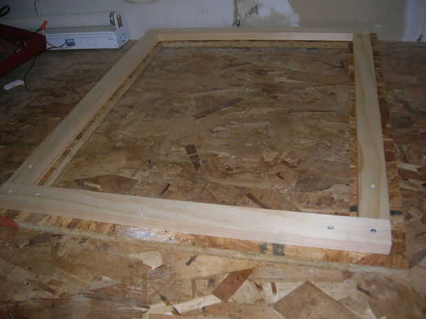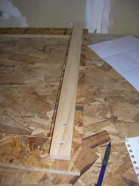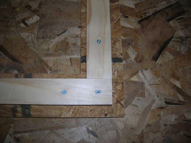 me centré el 21 3/4" pieza de pino tiene en 18" pieza de tablero de viruta a lo largo de las líneas solo marcado y poner un tornillo en cada extremo para sujetar en su lugar. luego tope un 27 3/4" pieza en la tira de pino, lo sostenida firmemente y añadido un scew. Repetí este proceso en el otro lado y en todo, realmente. otra vez, ojala las fotos hará más sentido que mi explicación. el punto es que es este marco de pino que va a dar fuerza y estabilidad a la cara del youe caja. una vez más, medir para comprobar que es cuadrada antes de agregar muchos tornillos.